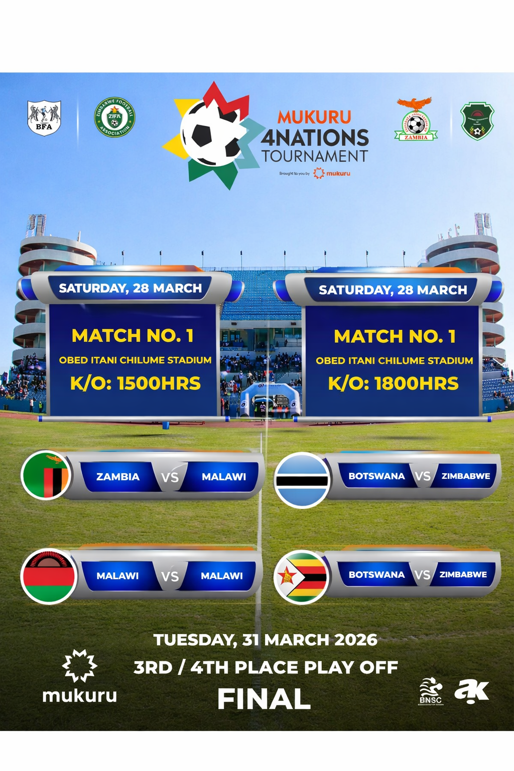 Get ready for the Mukuru 4 Nations Tournament! Watch Zambia, Malawi, Botswana, and Zimbabwe battle it out at Obed Itani Chilume Stadium from March 28–31, 2026. Exciting matches, passionate fans, and unforgettable football moments await—secure your tickets now!